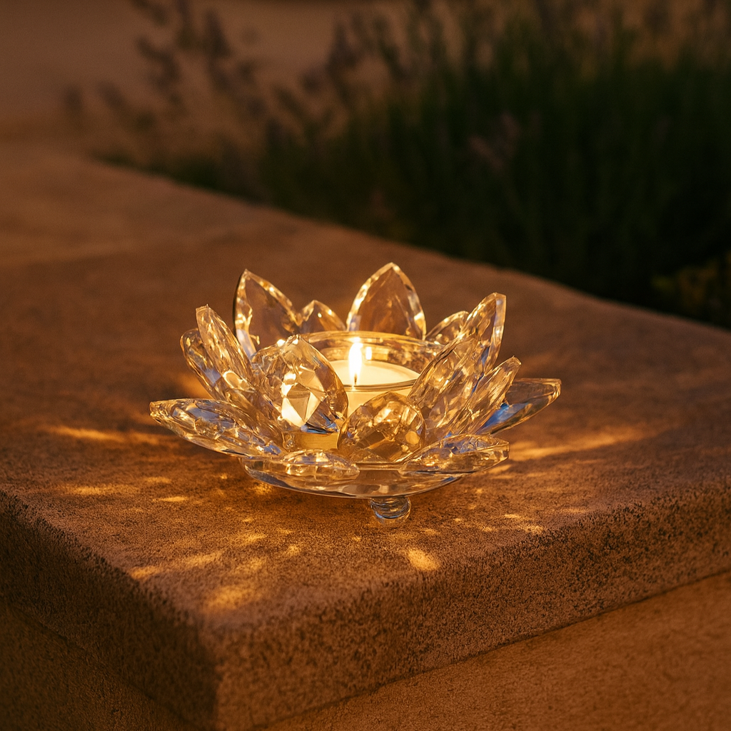 Lotosový svietnik z krištáľového skla pracuje ticho. Čajová sviečka sa v ňom láme do jemných vzorov, ktoré dopadajú na okolitú plochu a prirodzene stlmia miestnosť. Na nočnom stolíku, pri vani alebo v obývacom zákutí vytvára sústredený bod pokoja. Hluk dňa sa rozptýli v mäkkých odrazoch, rytmus sa zarovná.